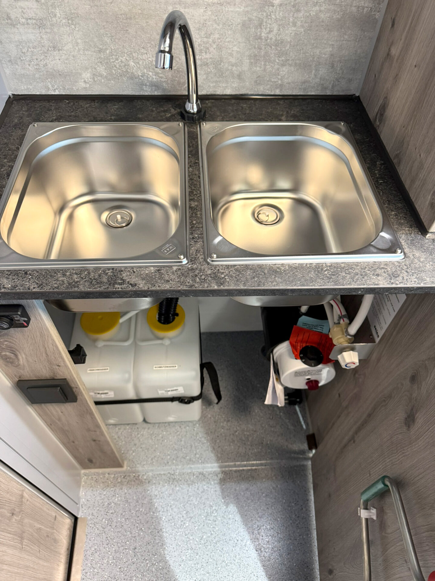 - Warmwasser-Hygienepaket mit zwei Edelstahl Doppelwaschbecken, Papier- und Seifenspender Edelstahl