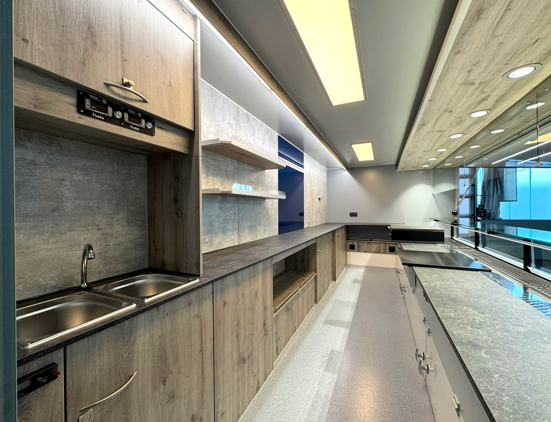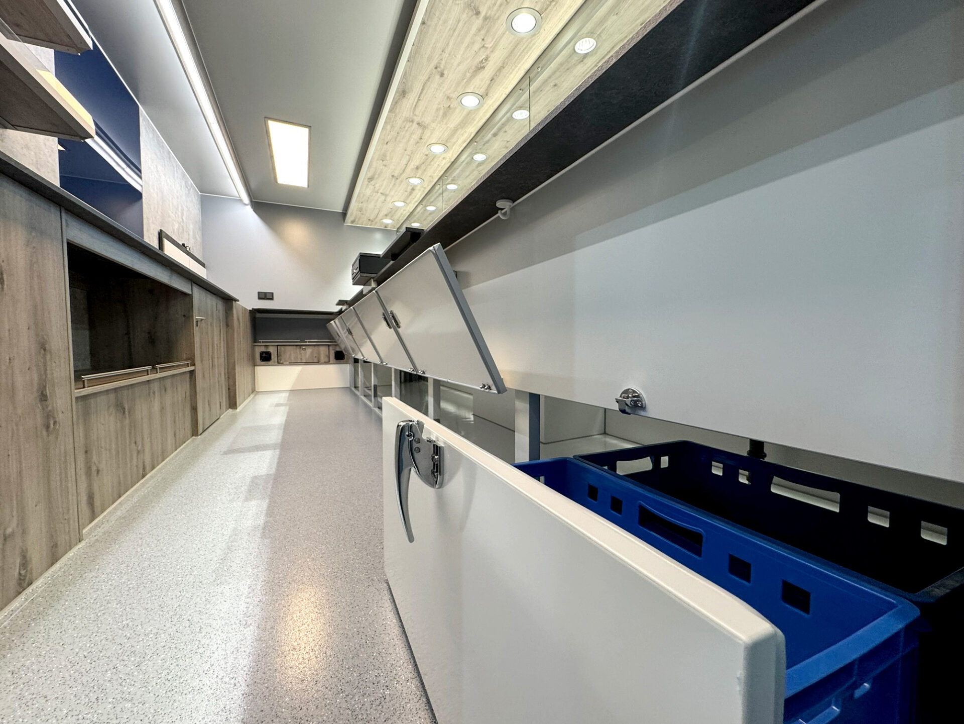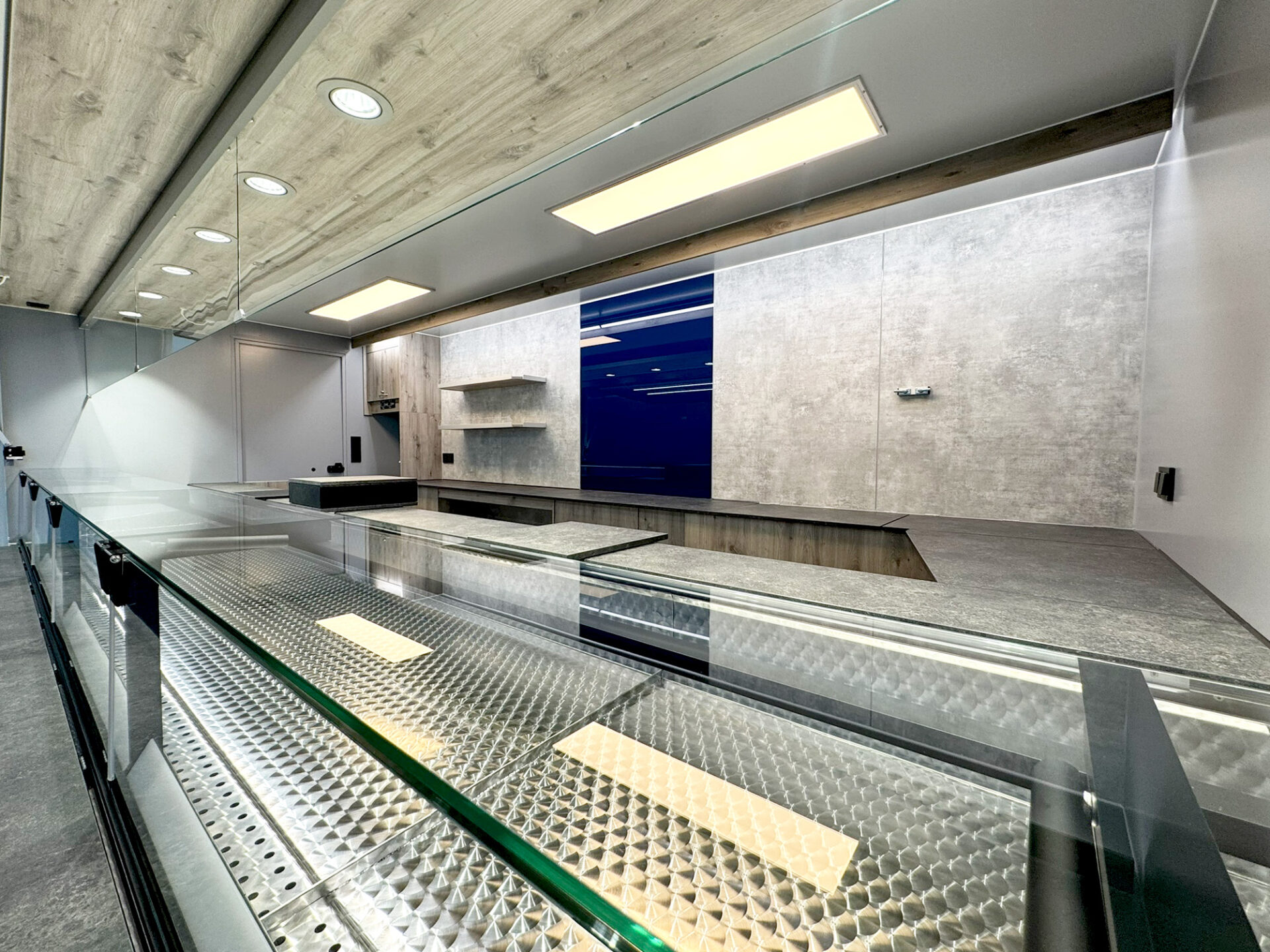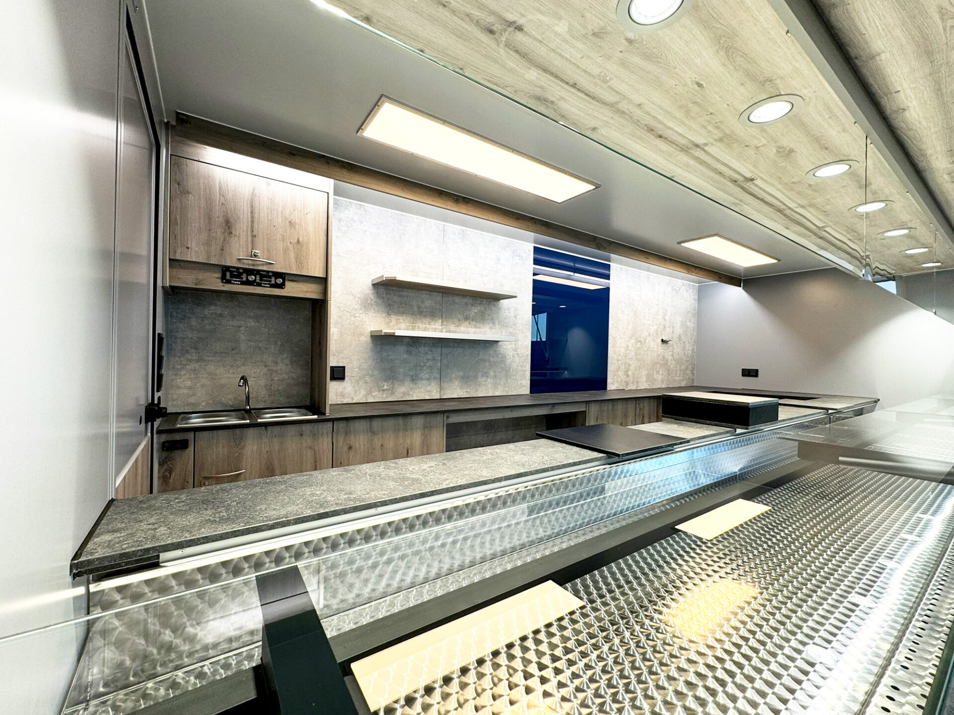 Im Zentrum des Verkaufsfahrzeugs Fisch steht die leistungsstarke Eurotop Umluft-Kühltheke. Diese Hochleistungstheke garantiert eine gleichmäßige Kühlung über die gesamte Auslage hinweg und sorgt dafür, dass Fisch und Meeresfrüchte stets frisch und ansprechend präsentiert werden. Die Umlufttechnik gewährleistet konstante Temperaturen, selbst bei hohen Außentemperaturen oder intensiver Nutzung. Ergänzt wird dieses System durch eine komplette Unterkühlung der Theke, die zusätzlich für optimale Frischebedingungen sorgt und die Haltbarkeit der Ware verlängert.