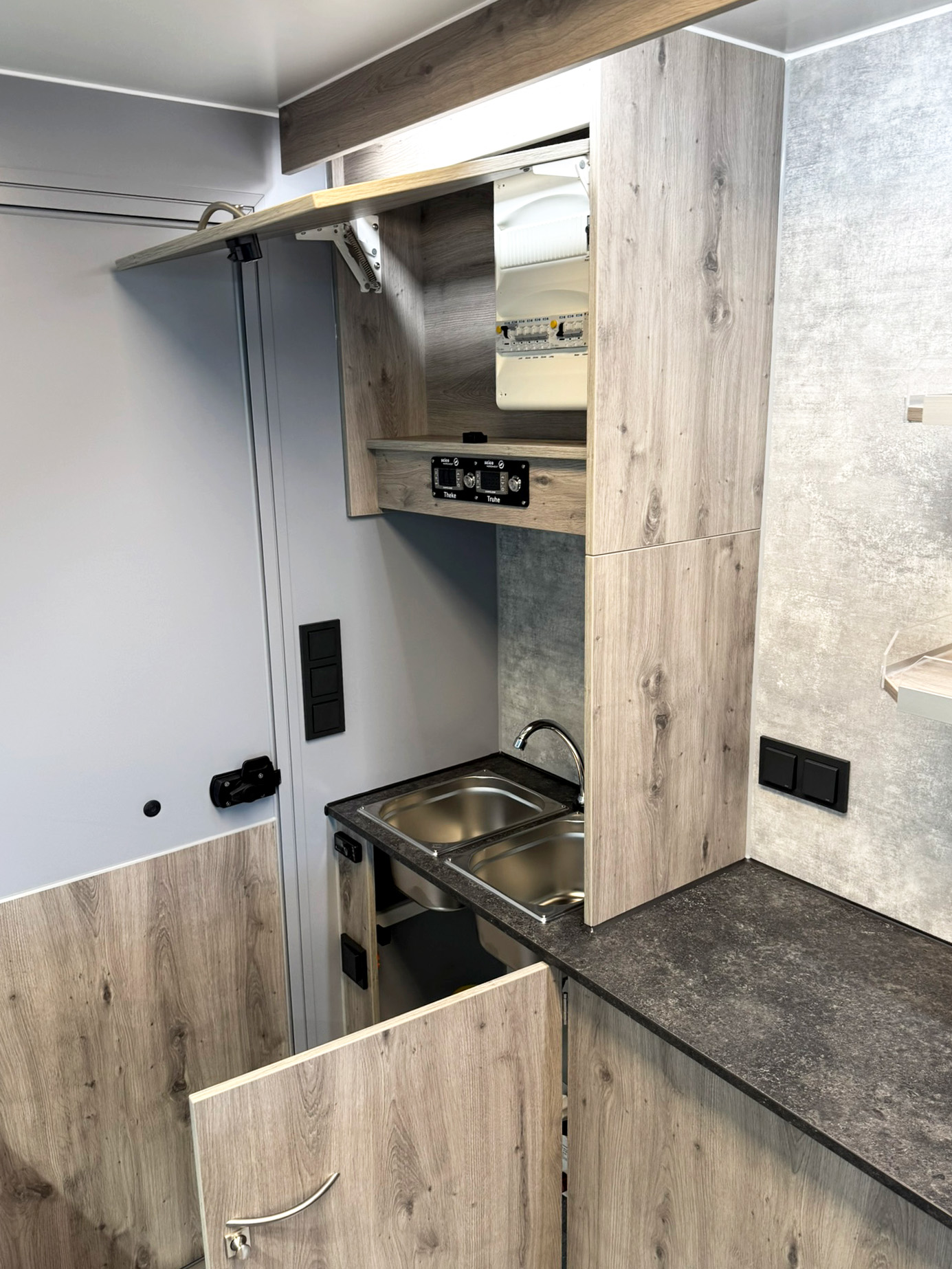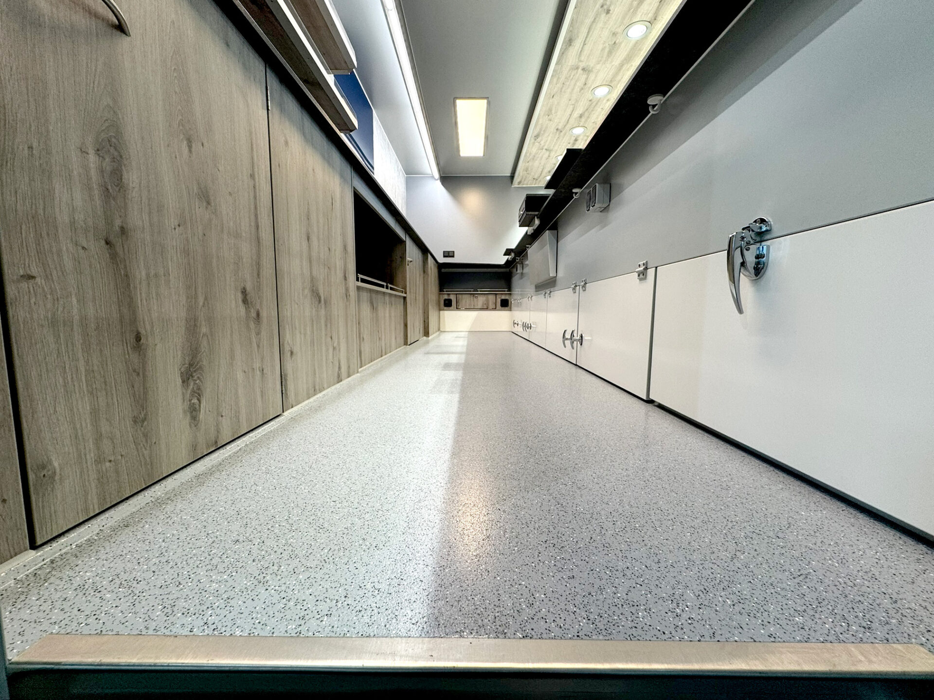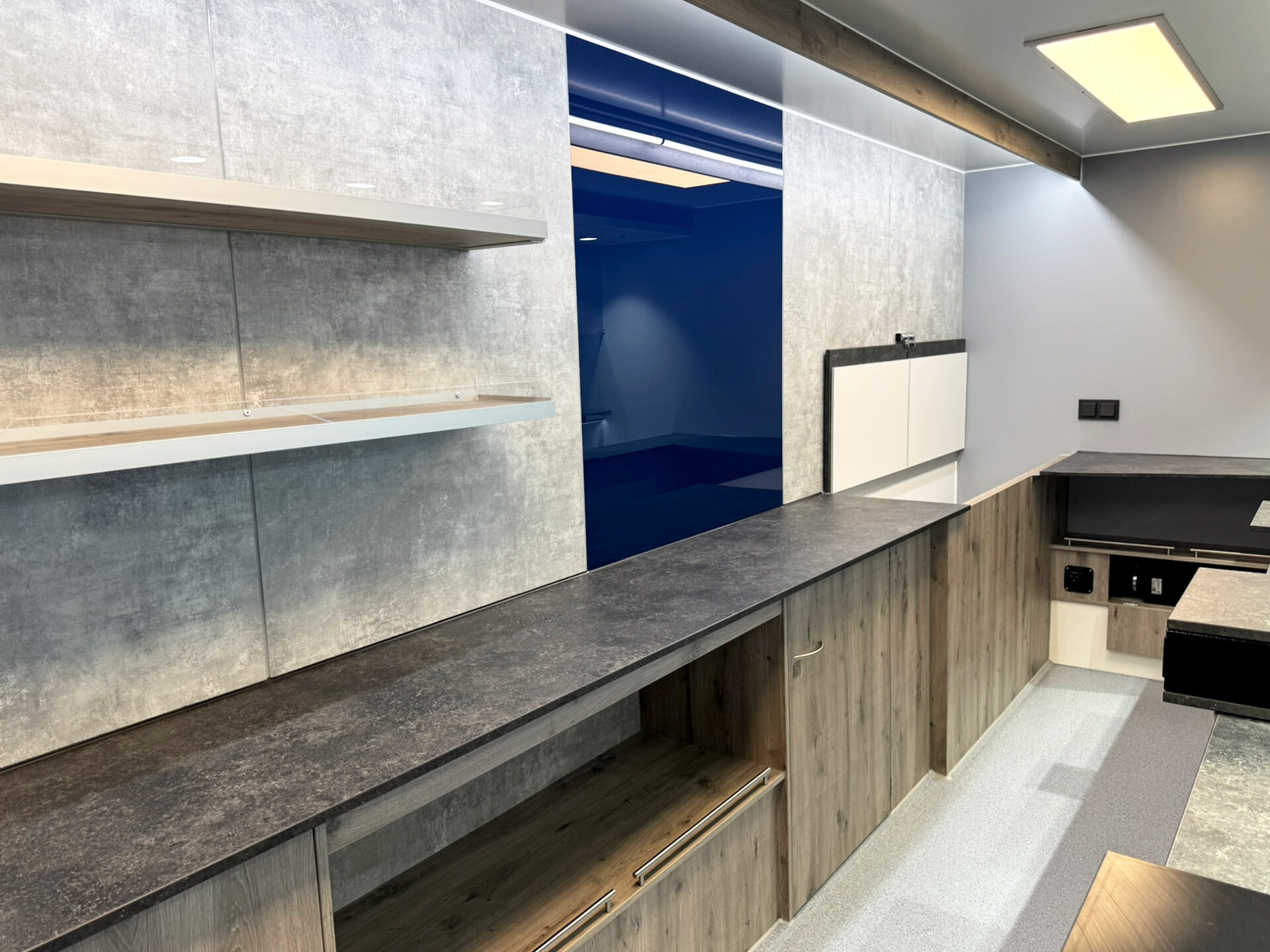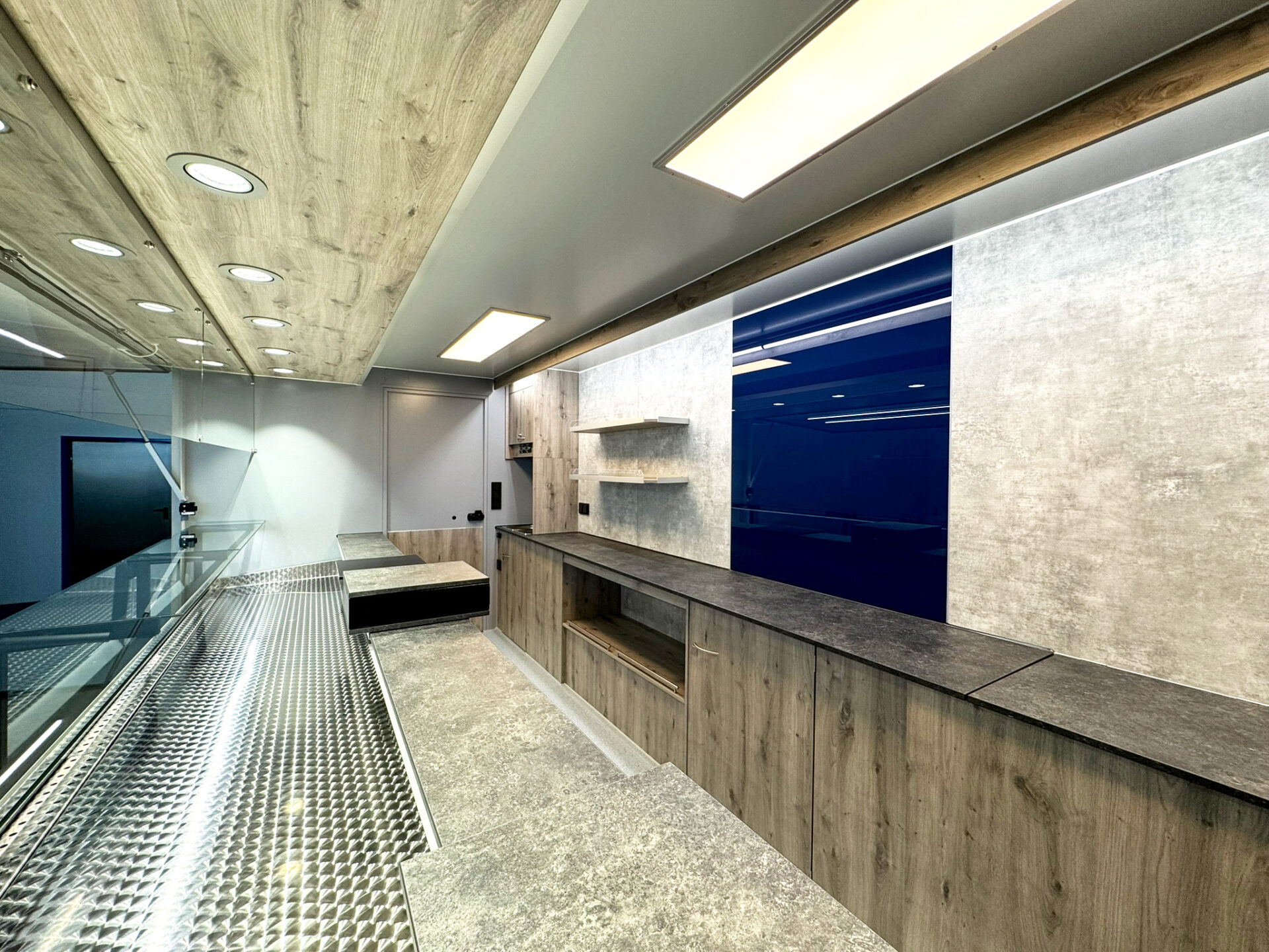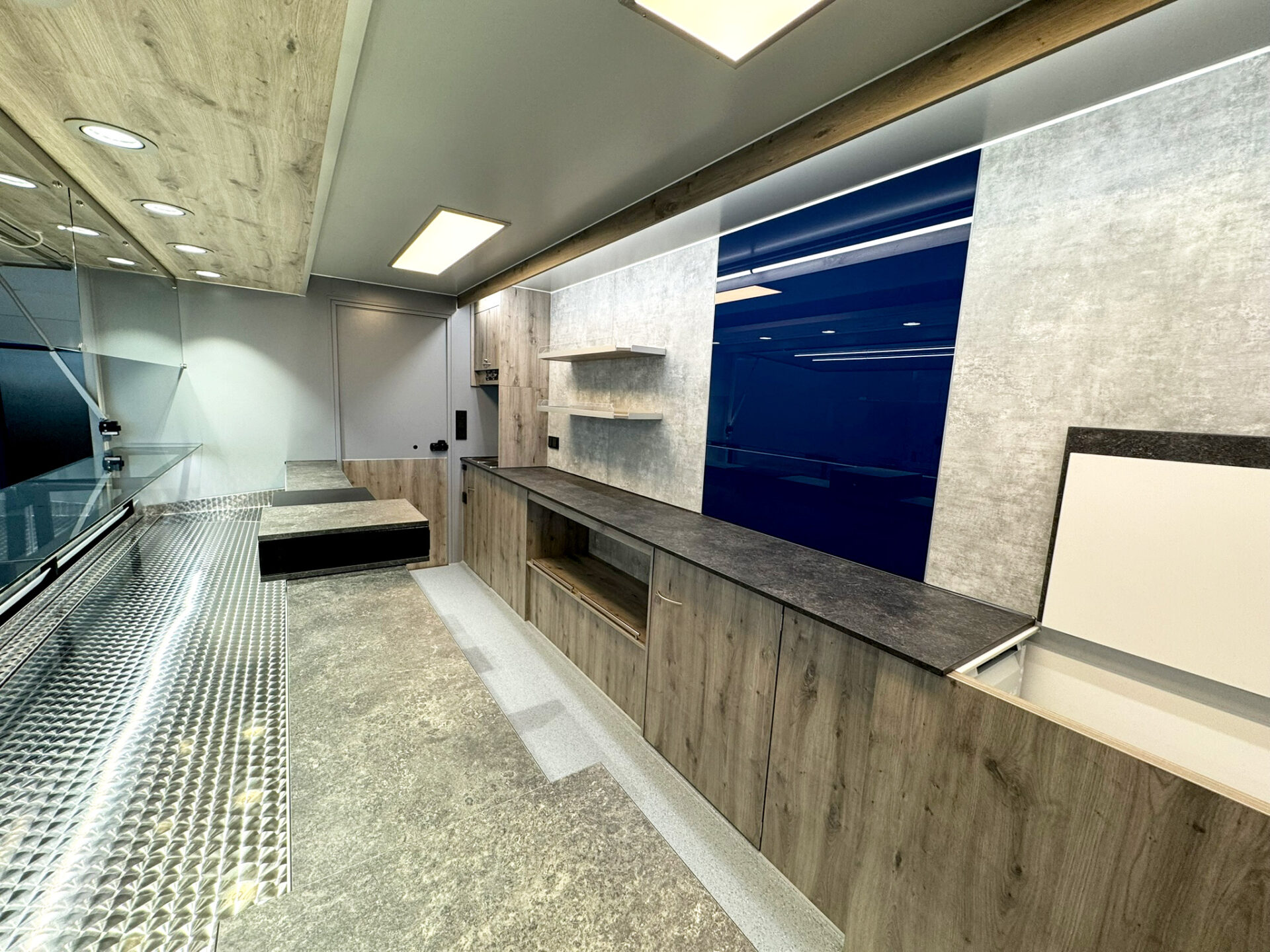 Im Zentrum des Verkaufsfahrzeugs Fisch steht die leistungsstarke Eurotop Umluft-Kühltheke. Diese Hochleistungstheke garantiert eine gleichmäßige Kühlung über die gesamte Auslage hinweg und sorgt dafür, dass Fisch und Meeresfrüchte stets frisch und ansprechend präsentiert werden. Die Umlufttechnik gewährleistet konstante Temperaturen, selbst bei hohen Außentemperaturen oder intensiver Nutzung. Ergänzt wird dieses System durch eine komplette Unterkühlung der Theke, die zusätzlich für optimale Frischebedingungen sorgt und die Haltbarkeit der Ware verlängert.