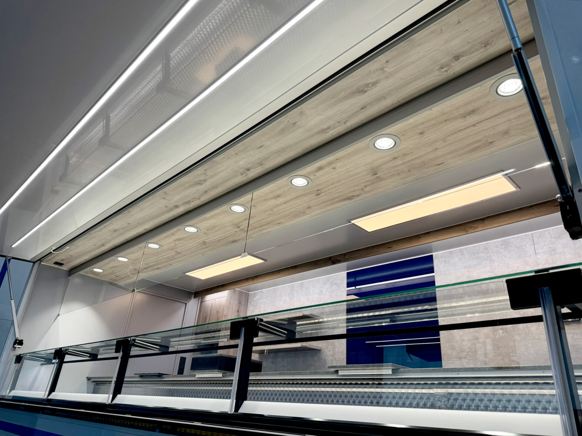 - LED Technikpaket Plus+: LED Paneele im Gangbereich, LED Strahler über der Theke, Ausleuchtung unterhalb der Verkaufsklappe
