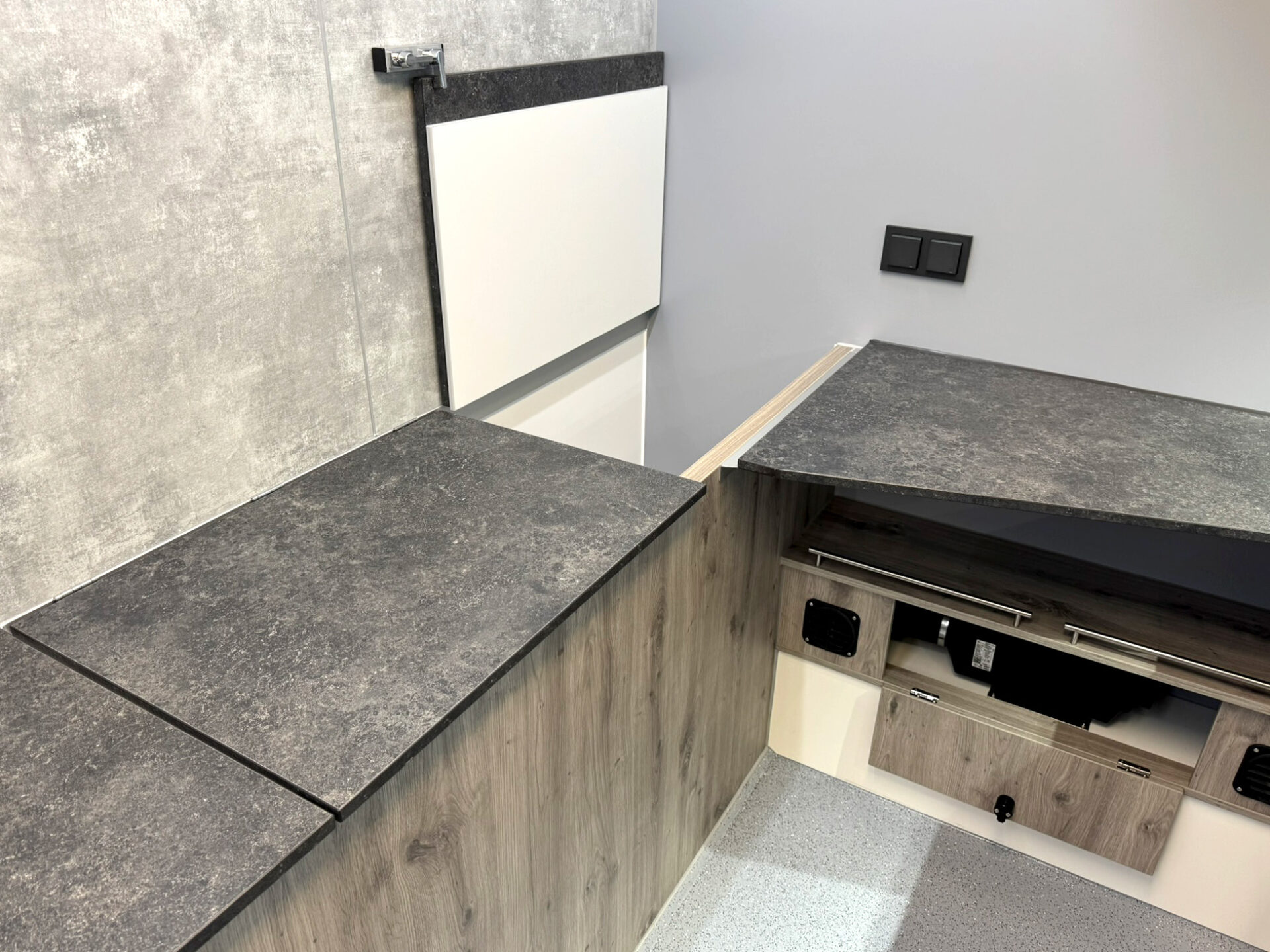 - Komplette Unterkühlung der Theke mit nach oben klappbaren Türen und einem Auszug