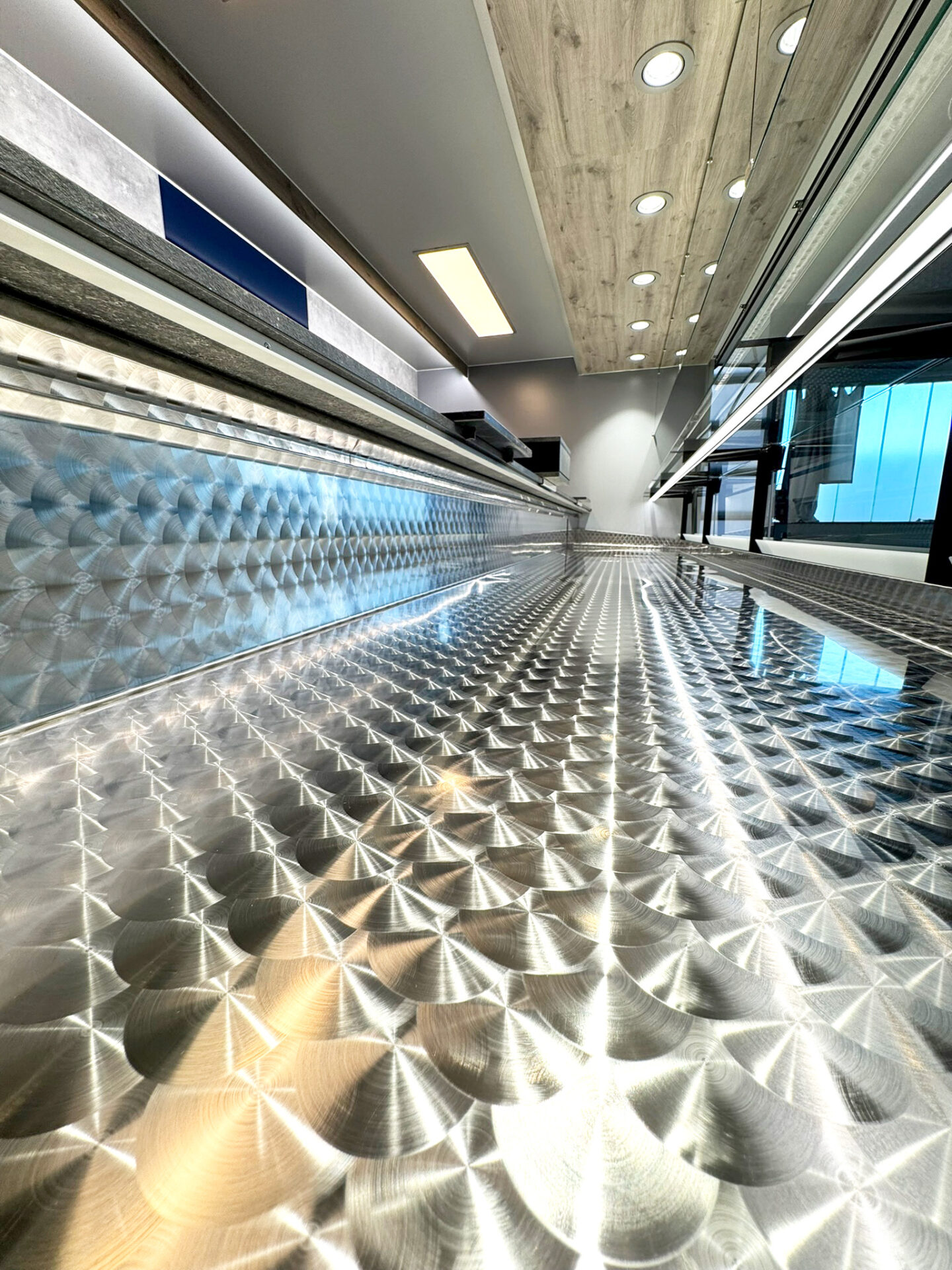- Thekenauslage als nahtlose Edelstahlwanne, Auslagentiefe 800 mm