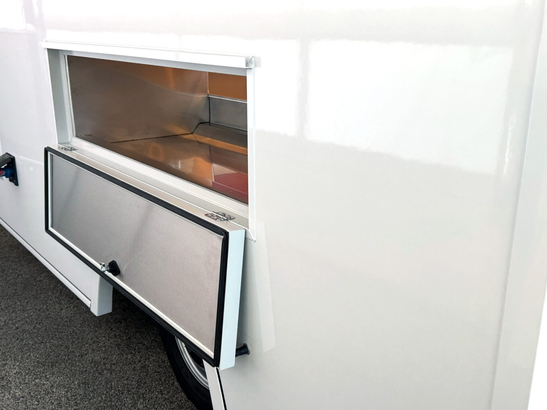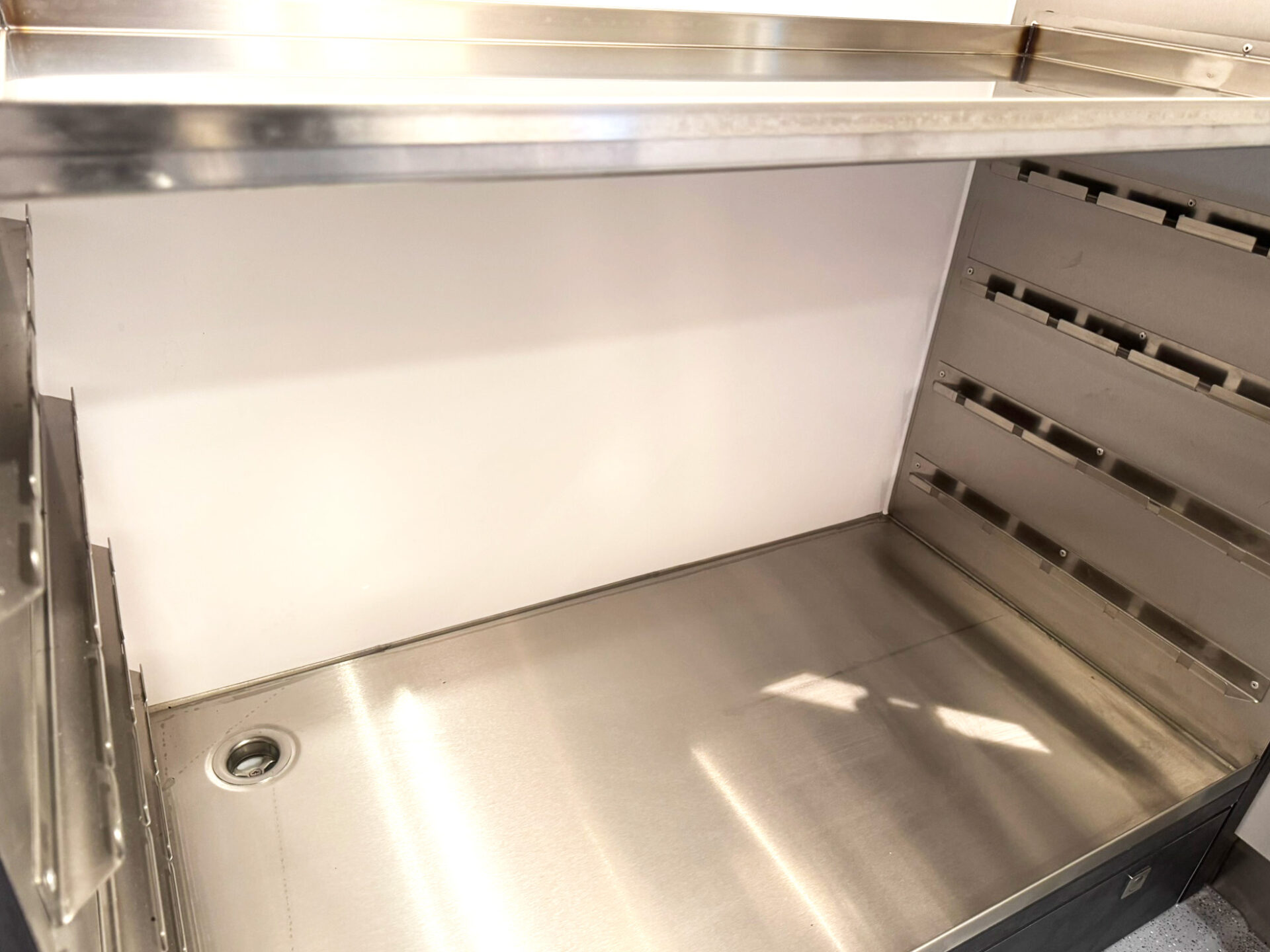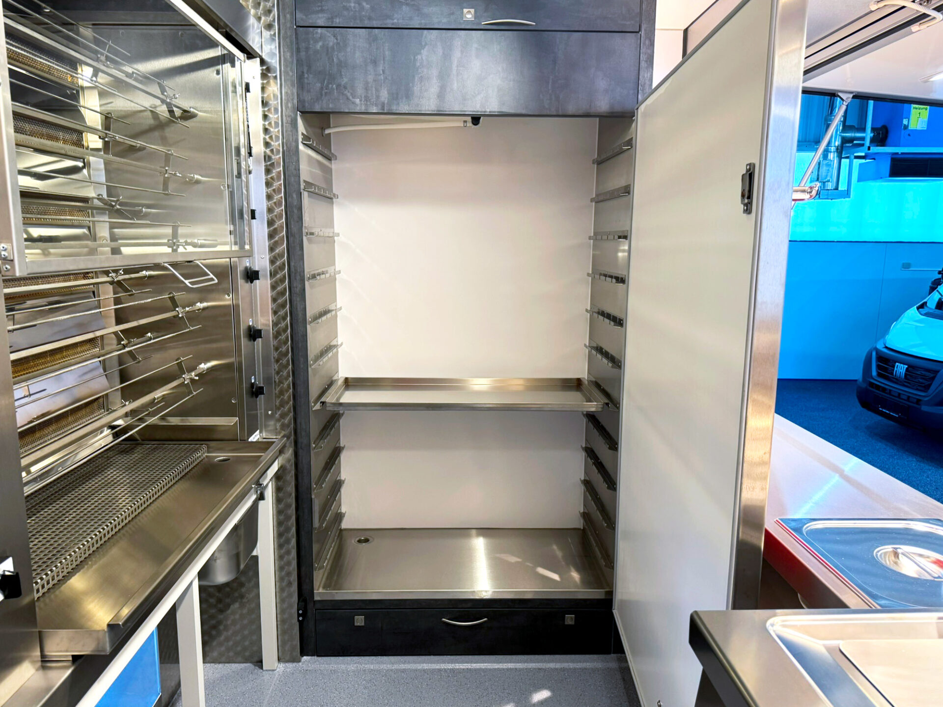 Ein weiteres Highlight des Hähnchengrillmobils ist der großzügige Spießkühlschrank. Er bietet ausreichend Platz, um alle Ihre Zutaten frisch und auf optimaler Temperatur zu lagern. So können Sie sicherstellen, dass Ihre Hähnchen und anderen Zutaten immer die beste Qualität aufweisen. Der Kühlschrank ist so konzipiert, dass er , auch wenn’s mal hoch her geht, leicht zugänglich ist und Ihnen somit ein effizientes Arbeiten ermöglicht.