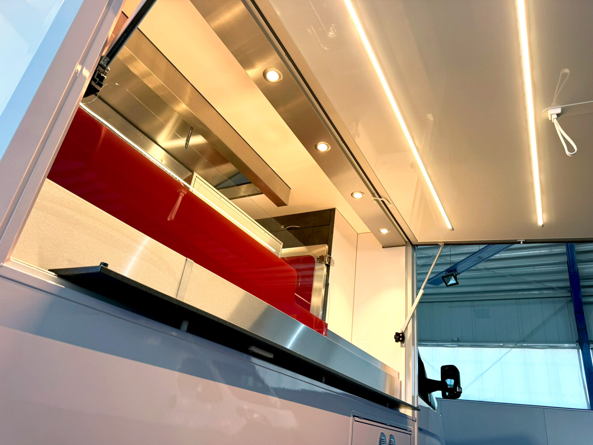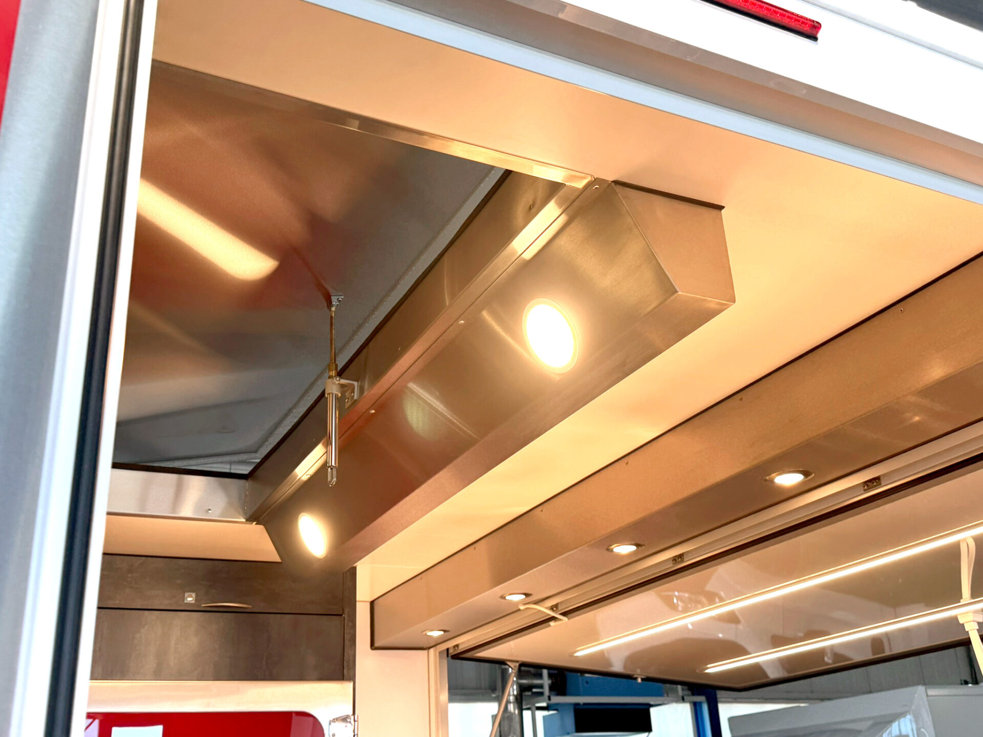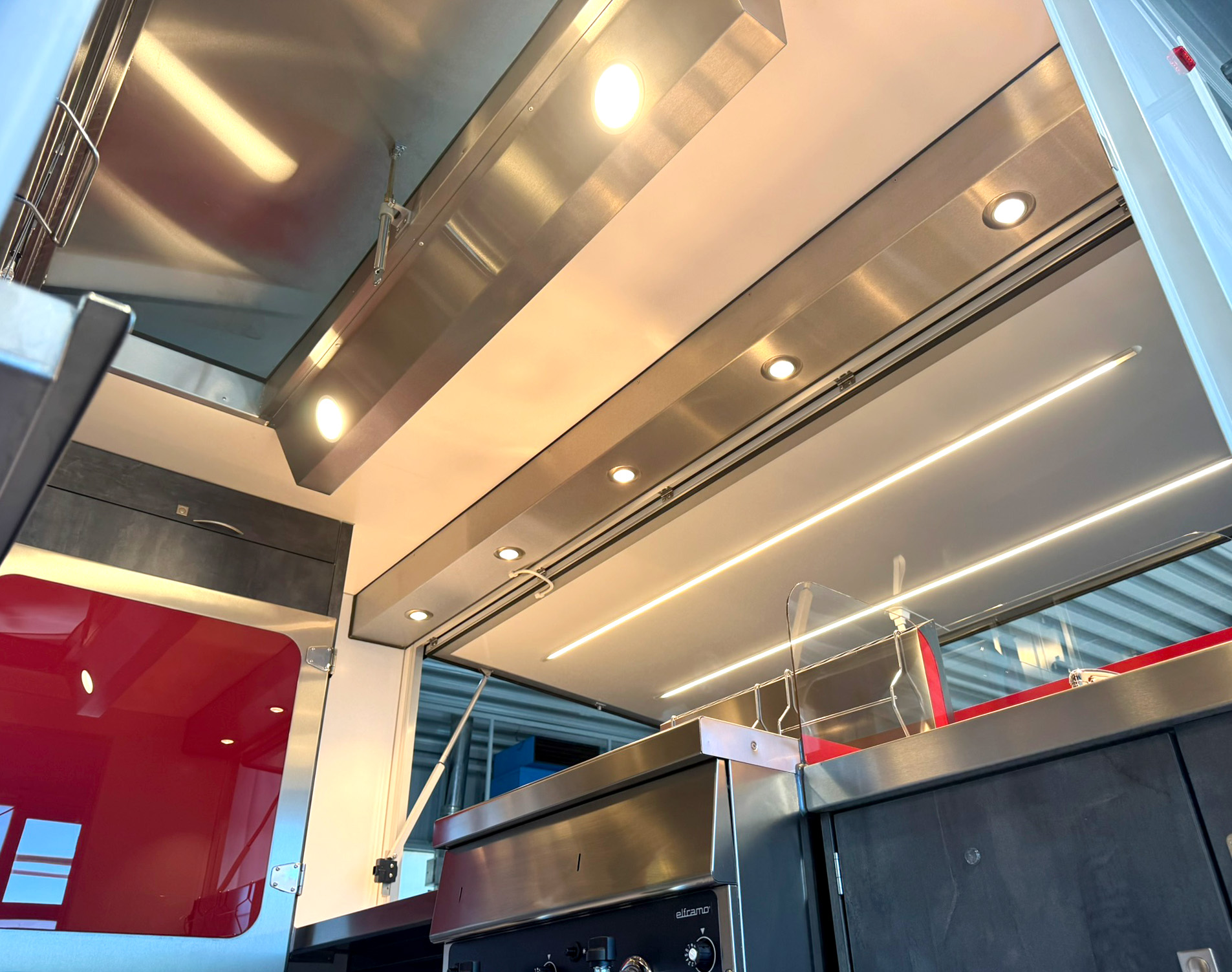 Die moderne LED-Beleuchtung sorgt dafür, dass Sie auch bei schlechten Lichtverhältnissen optimal arbeiten können. Sie beleuchtet den gesamten Arbeitsbereich gleichmäßig und ermöglicht eine angenehme Arbeitsatmosphäre. Gleichzeitig tragen die LEDs zur Energieeffizienz des Hähnchengrillmobils bei, da sie im Vergleich zu herkömmlichen Beleuchtungssystemen weniger Strom verbrauchen.