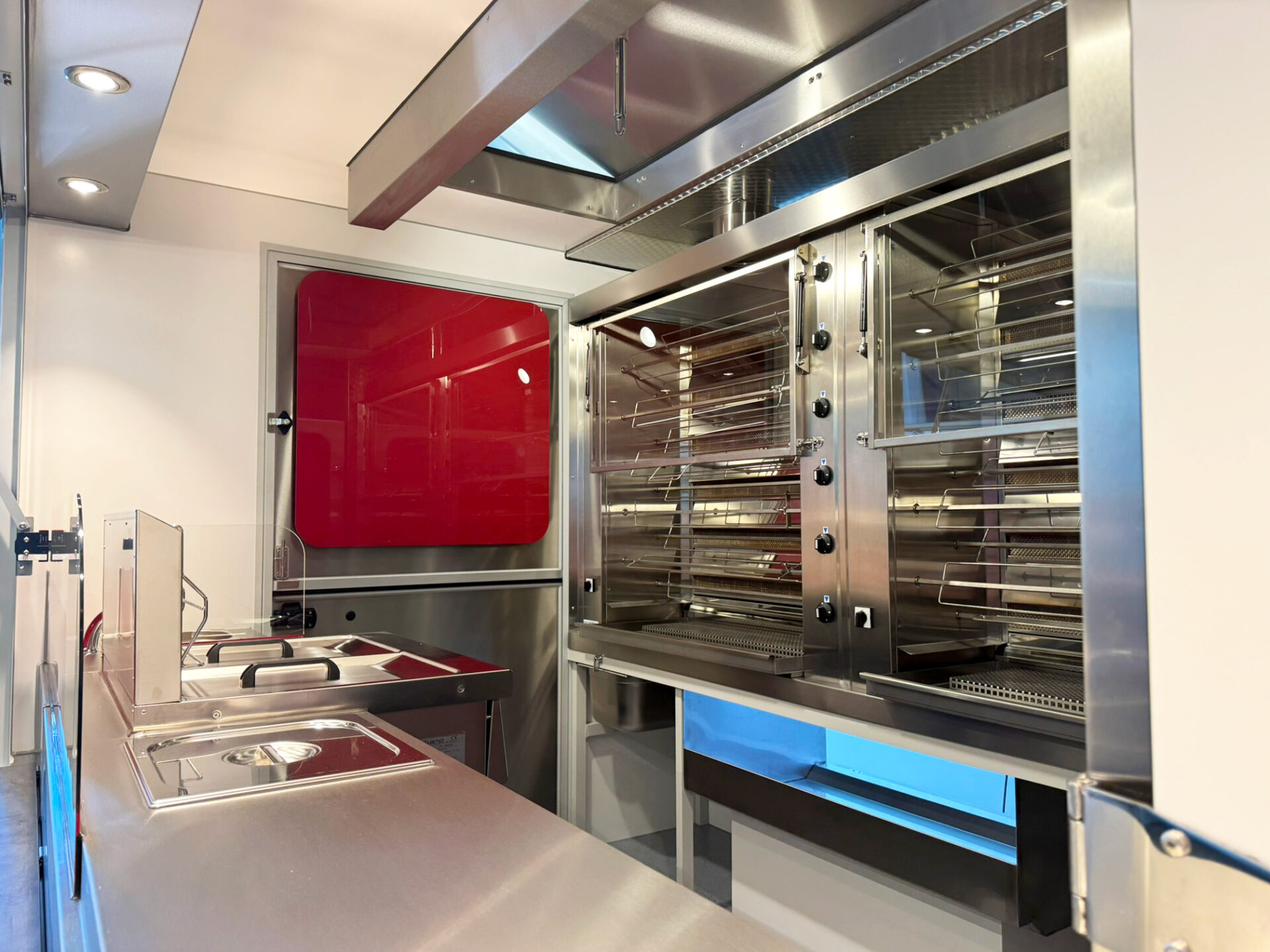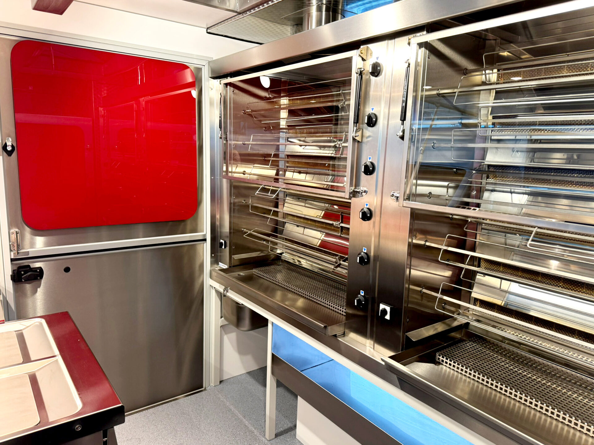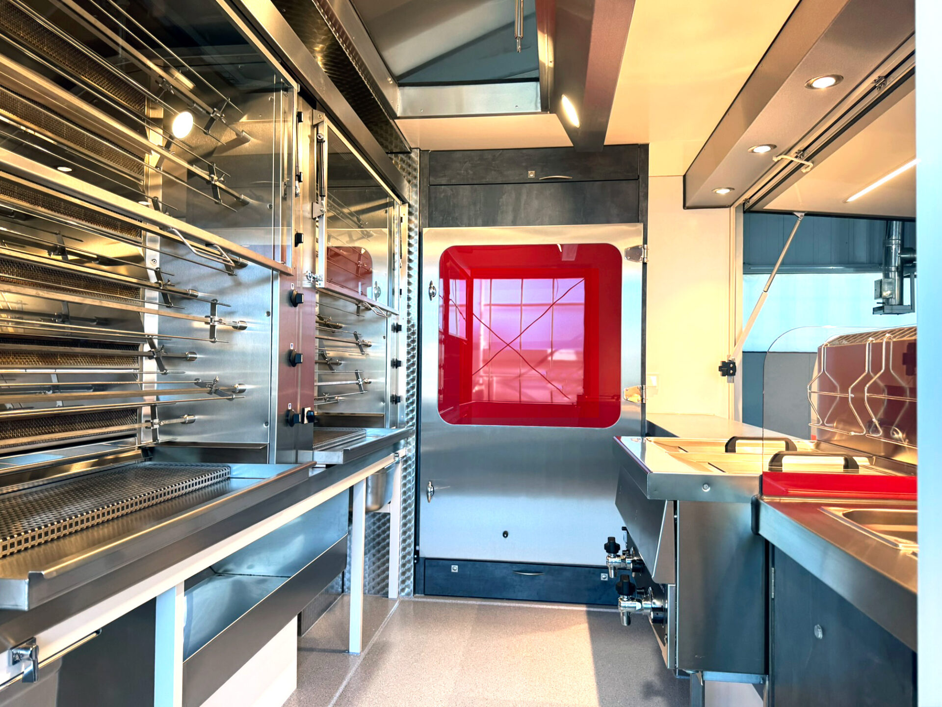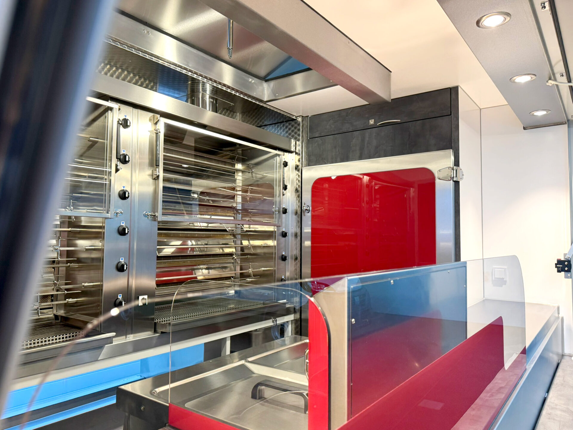 Das Hähnchengrillmobil bietet Ihnen nicht nur modernste Technik, sondern auch ein durchdachtes Konzept, das Ihren Arbeitsalltag erleichtert. Von der leistungsstarken Doppelgrillanlage über die vielseitige Zwei-Becken-Fritteuse bis hin zum geräumigen Spießkühlschrank und der energieeffizienten LED-Beleuchtung – jedes Detail wurde so gestaltet, dass es Ihre Anforderungen als mobiler Gastronom erfüllt.