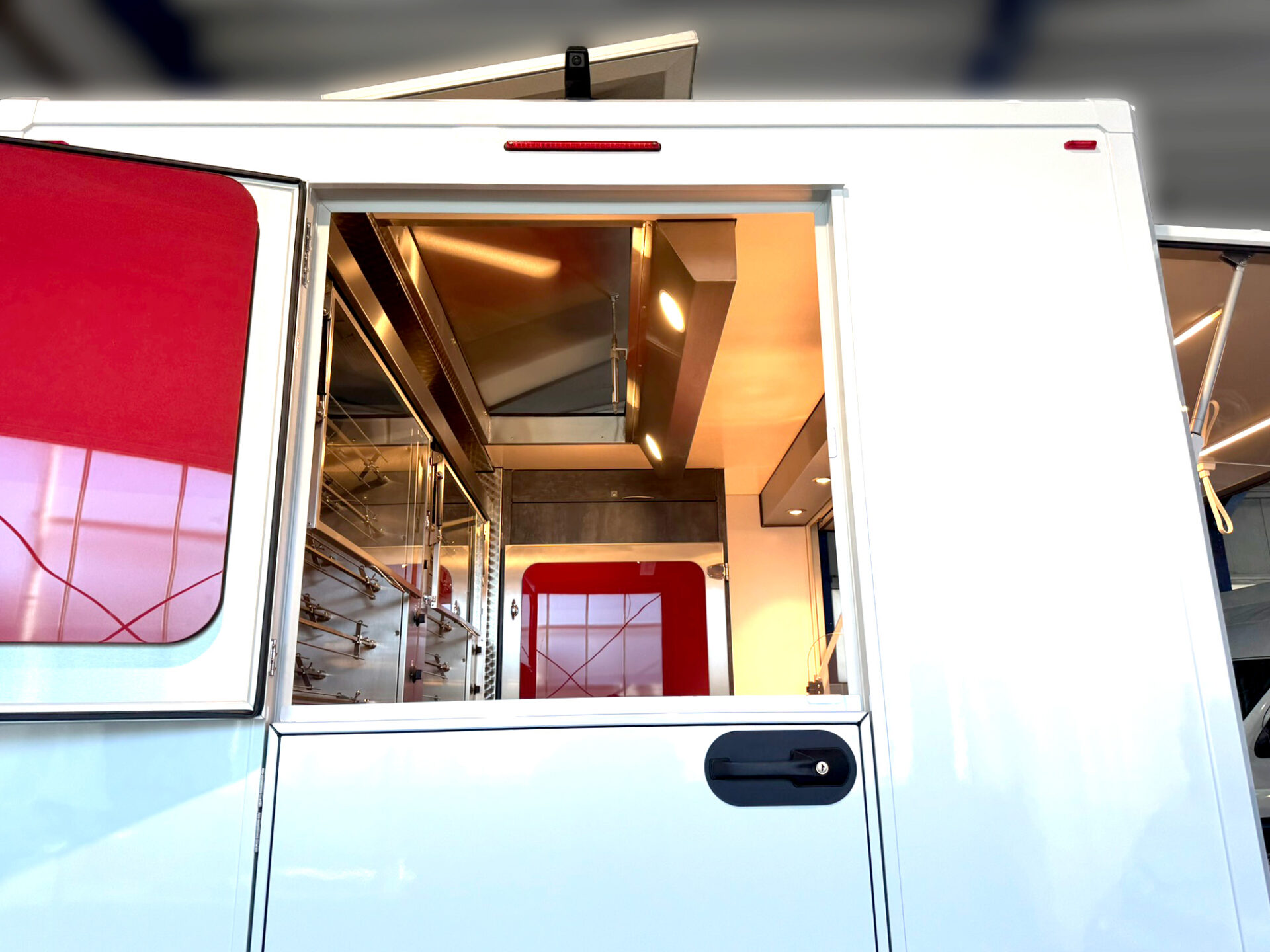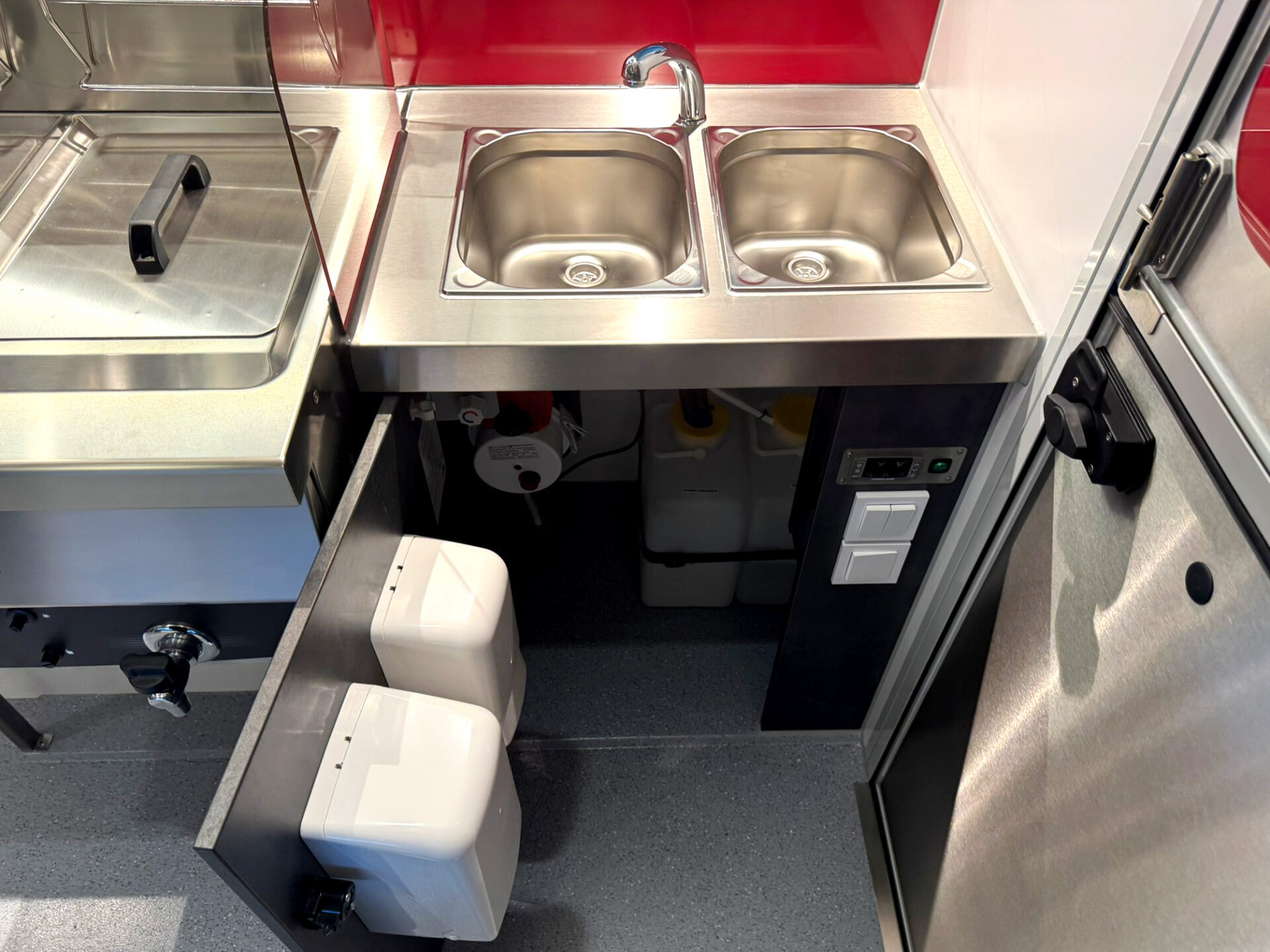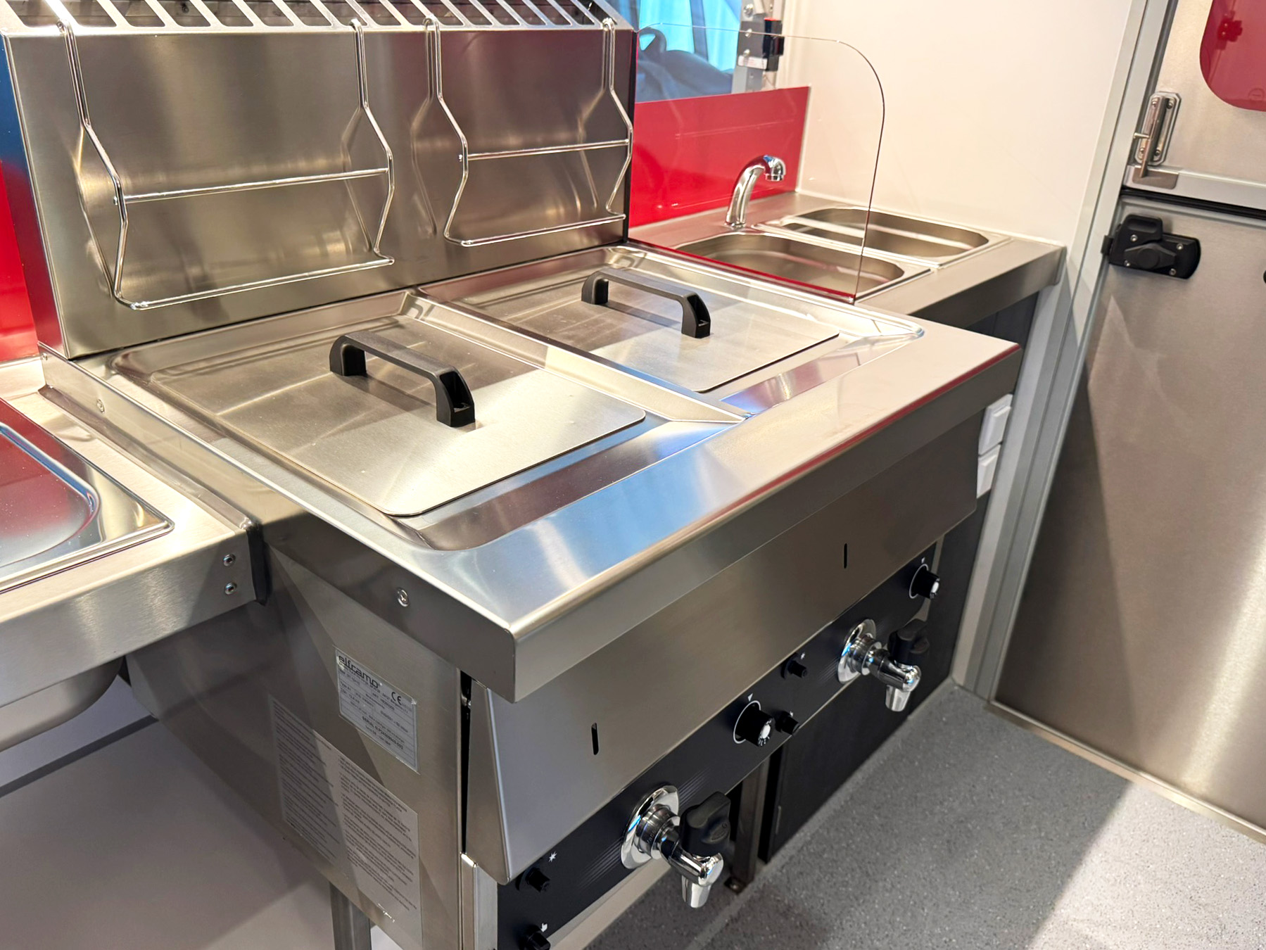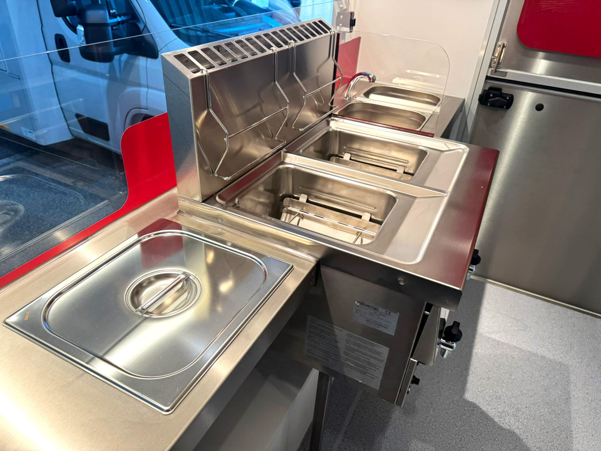 Das Hähnchengrillmobil bietet Ihnen nicht nur modernste Technik, sondern auch ein durchdachtes Konzept, das Ihren Arbeitsalltag erleichtert. Von der leistungsstarken Doppelgrillanlage über die vielseitige Zwei-Becken-Fritteuse bis hin zum geräumigen Spießkühlschrank und der energieeffizienten LED-Beleuchtung – jedes Detail wurde so gestaltet, dass es Ihre Anforderungen als mobiler Gastronom erfüllt.