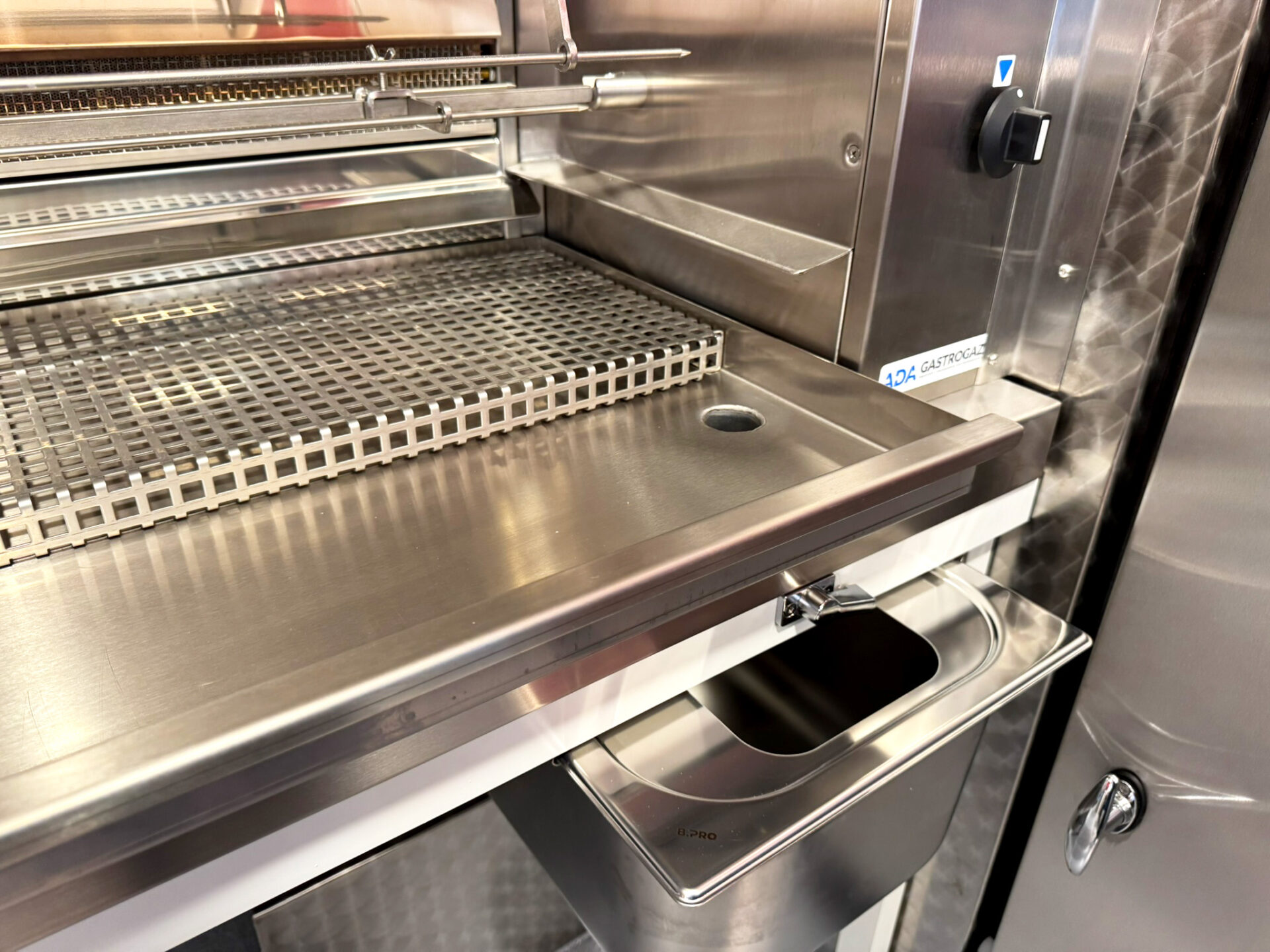 - ADA Infrarot Hähnchengrill. Doppelreihig, mit Zentralantrieb, Quarzbeleuchtung, Fettauffangbecken und nach oben klappbare Hitzeschutztüten. Für 22 Grillspieße incl. Langgabeln. Abzug mit Regendach