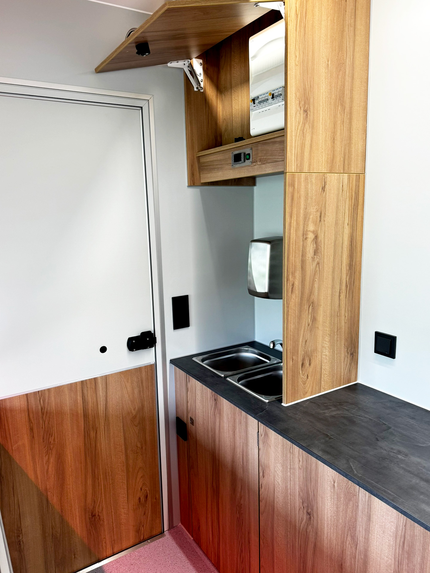 - Hängeschrank mit integrierter Schalttafel über dem Hygienepaket