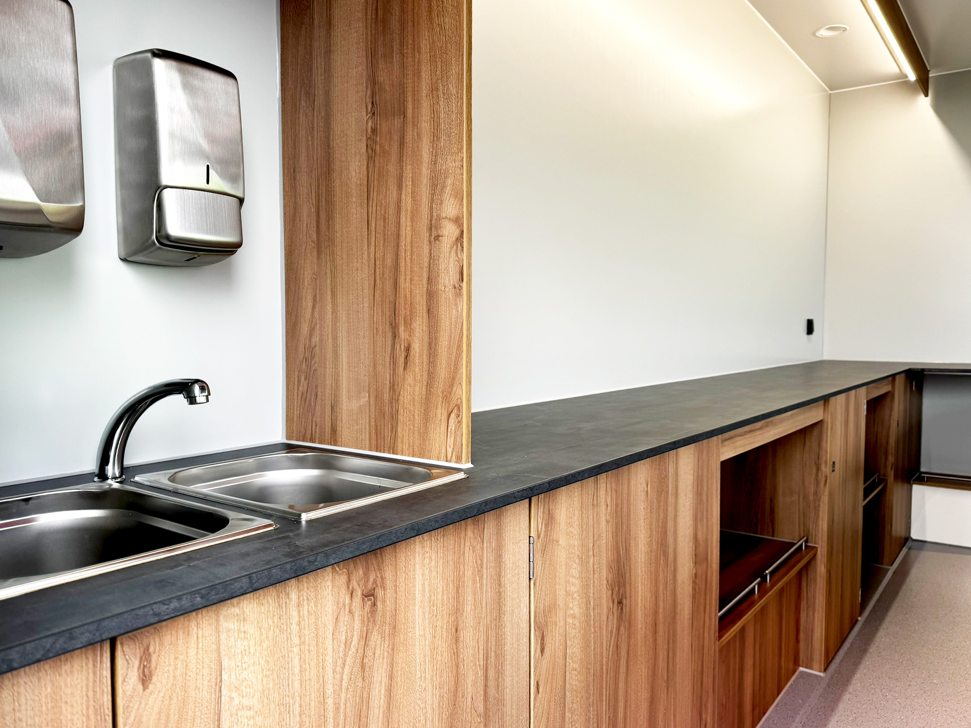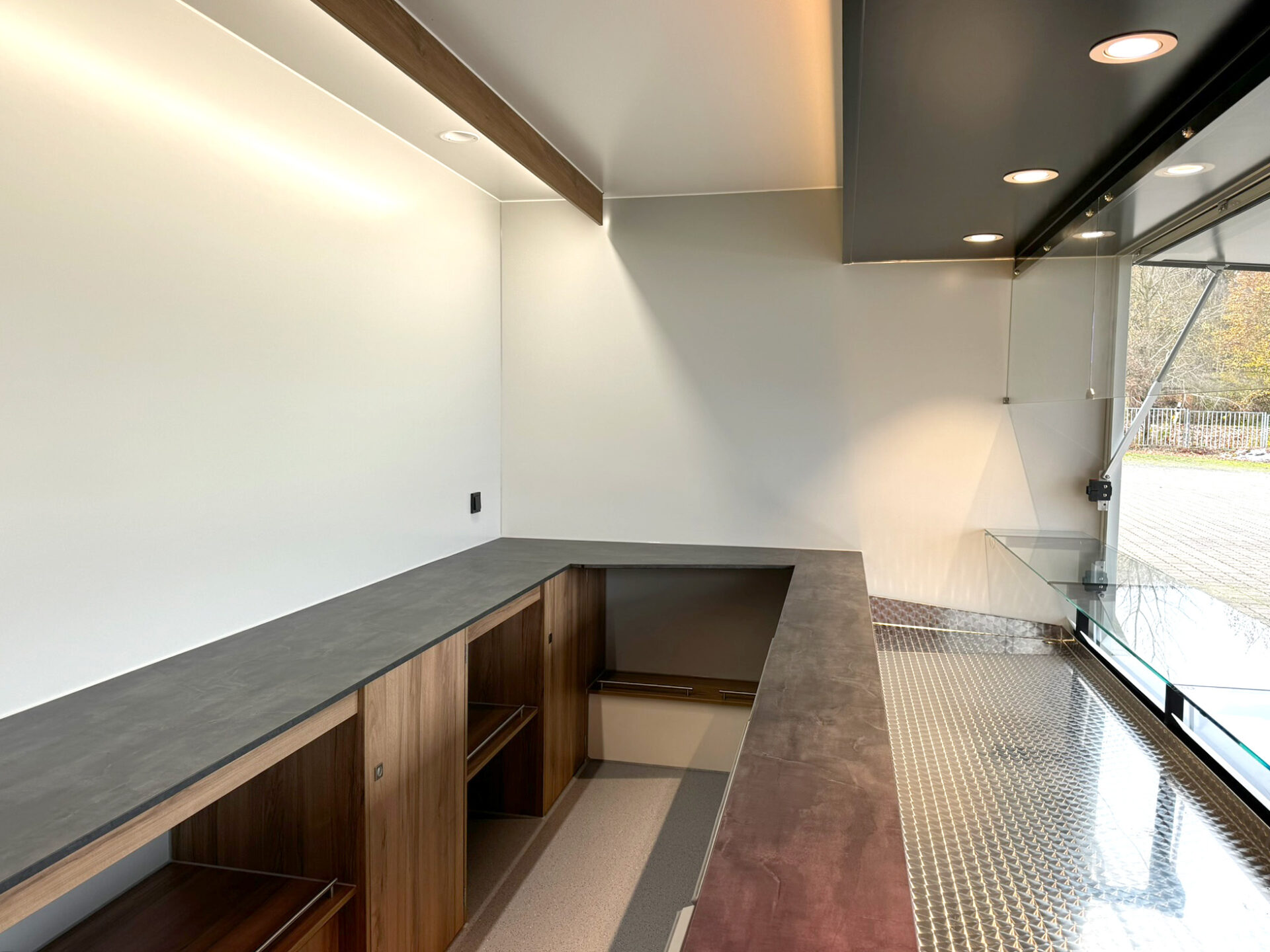 Die Innenausstattung kann je nach Art der verkauften Produkte gestaltet werden. Wenn Sie beispielsweise Fleisch oder Käse verkaufen, könnten zusätzliche Regale, Schneideflächen oder auch ein Sichtkühlschrank auf der Arbeitsfläche nützlich sein. Für den Verkauf von Backwaren könnten Sie dagegen mehr Ablageflächen und Präsentationsmöglichkeiten einbauen. Auch eine Kaffeemaschine oder ein kleiner Ofen für frische Snacks kann problemlos in das Konzept integriert werden.