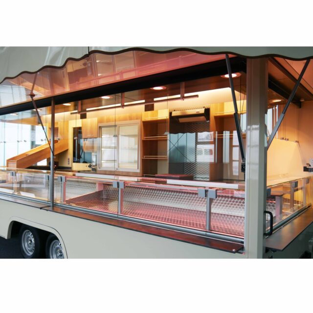 Marktanhänger für die Wochenmarkt Direktvermarktung von Fleisch oder Eiern. Verkaufsfahrzeug mit Backwarenauslage, Kühltheke, Käsetreppe