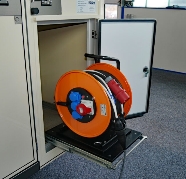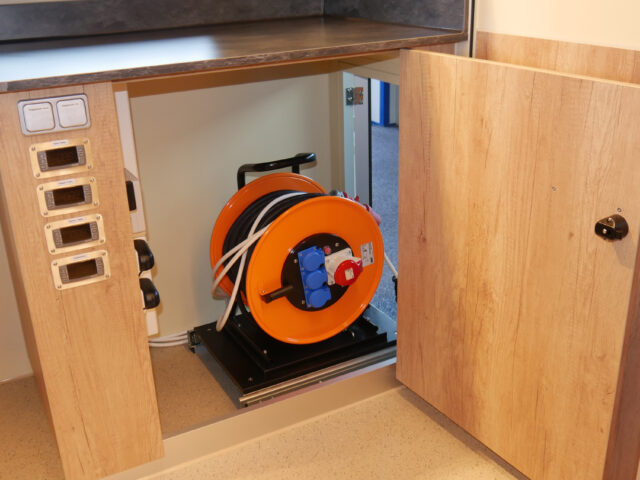 - Kabeltrommel im Unterschrank auf Auszugsgestell